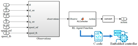 This paper uses RL controller to control the current of PMSM current loop. A typical FOC architecture was developed in Simulink, where the outer loop controller controls the speed, while the inner loop PI controller controls the D-axis and Q-axis currents (Figure 2). The RL module is created in the current loop, which replaces the current loop PI controller for this architecture.