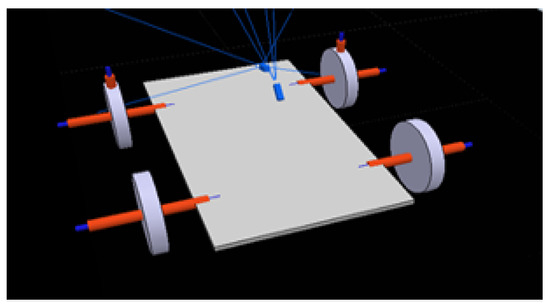 - The car (Figure 2), the main agent, which only uses primitive shapes and contains all of the necessary actuators and sensors. A cuboid of 60 × 30 × 2 cm is used for the base and four cylinders with 15 cm radius and 3 cm height for the wheels; these are connected to the base through joints. The back wheels use one joint each to work as motors, while the front wheels use two joints each; one works as a slipping joint and the other is responsible for steering and is perpendicular to the floor.
