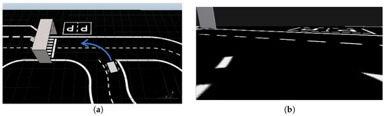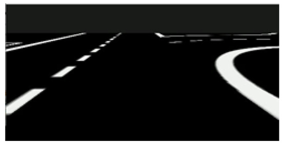 As the robot cameras grab real images from the track and the training dataset is created with virtual images, it was necessary to adapt the images from the car in order to make them compatible with the neural network model. First, a Region of Interest similar to the one used in the simulation dataset was selected (see Figure 17a); then, the image was segmented to highlight only the white lines on the track (see Figure 17b).