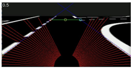 This situation involves changing lanes, which consequently, involves “ignoring” a lane delimiting line, making it another exception (Figure 7). The simulation car’s coordinates indicate the presence of an intersection. In terms of interpretation, the system saves the coordinates of the second transition found in the radial lines. The car maintains its direction until only one delimiting lane line is found.