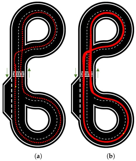 When increasing the velocity to 12.5 rad/s and 15 rad/s (Figure 14), the consistency and accuracy of the path followed by the car were kept approximately the same as in the previous test, with small variations seen near the zebra crossing and intersections. However, as the NNM was trained with still images, a steering adjustment was required for higher speeds; calculated on a percentage basis to work similarly for different velocities, this adjustment was applied to the deviated angle calculated.