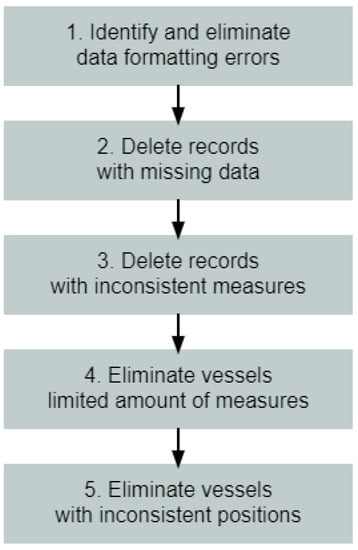 Flowchart of the data-cleaning procedure. (1) Identifying and eliminating any data-formatting errors; (2) removing records with missing data; (3) discarding records with incorrect data (such as velocity exceeding 100 knots, positional data on land, etc.); (4) excluding all vessels for which the number of sequential detections is below a certain threshold (100 points); (5) excluding any vessels that appear in two different and distant parts of the world within a short time span.