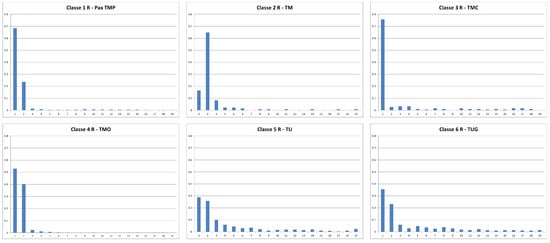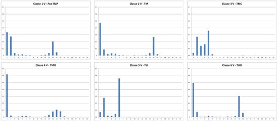 Figure 6 illustrates a more defined spontaneous separation of vessels into the six targeted classes for classification, compared to the outputs produced by previous pre-processing strategies. Class 2 (TM) remains the most difficult to characterize and therefore to be separated from the others. In all cases, even with this pre-processing strategy, the definition of the classification model is very complex due to the notable non-linear separability of some classes.