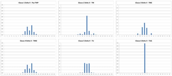 For illustrative purposes, we provide the statistical profile of the velocity, , of the change of route, , and of the dynamic delta of the velocity, , of a vessel randomly selected for each class. This is to give an idea of the type of input that the adaptive algorithms must manage to define an analysis model that allows the automatic classification of unknown vessels. See Figure 2, Figure 3 and Figure 4.