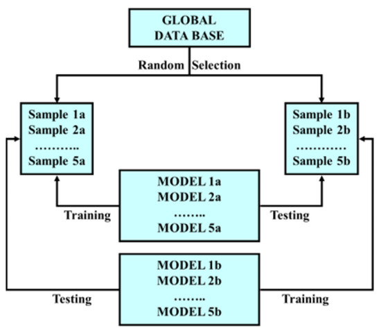For the experimental phase, a set of algorithms was utilized to explore and analyze the data. Some of the algorithms are commonly used in the literature (kNN [11,12], naive Bayes [13,14,15,16,17], majority vote [9,10,18]), while the remaining algorithms have been specifically developed by Semeion for pattern recognition. The objective was to compare the effectiveness and efficiency of the algorithms and determine which ones would yield the most accurate and reliable results: (a) backpropagation (Bp) [19,20,21]; (b) deep learning (Deep) [22,23,24]; (c) adaptive vector quantization (AVQ) [25,26,27,28]; (d) kNN [11,12]; (e) meta Bayes (Mb) [29]; (f) Conic Net [30]; (g) Sine Net (Sn) [31]; (h) bimodal (Bm) [32]; (i) majority vote (Mv) [9]; (j) naive Bayes [13,14,15,16,17]; (k) supervised contractive map (SVCm) [32]. The validation protocol used for all the algorithms is the training–testing protocol [33,34,35] (Figure 5: Validation protocol—5 × 2 CV (training–testing)).