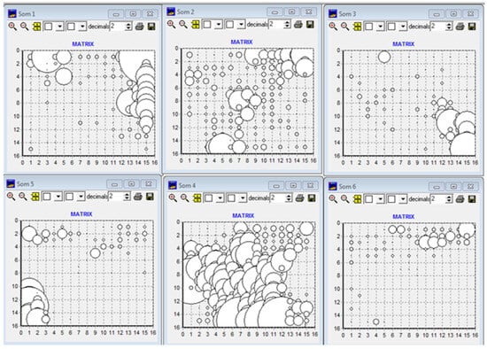 At this juncture, an unsupervised neural network is deployed once more to discern the extent to which our pre-processing step can spontaneously segregate the database into the six distinct vessel classes. A self-organizing map (SOM) [28] is used for this purpose with a square grid of 15 × 15, capable of generating 225 codebooks, where each codebook represents a similar group of vessels; Figure 6 shows the results of the SOM software.