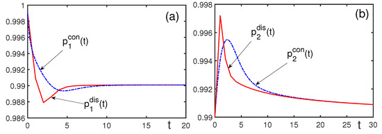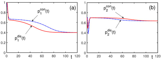 Figure 1 presents the case where the fractions (probabilities) and starting from the same values smoothly tend to the same fixed points, being only slightly different at intermediate times.