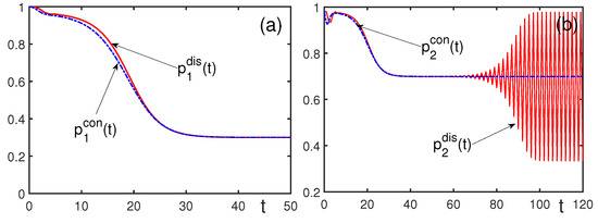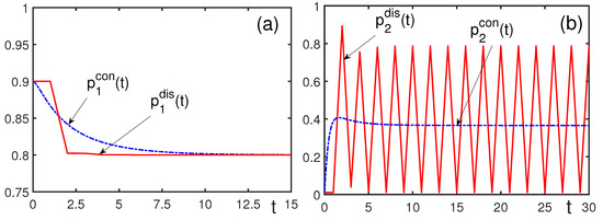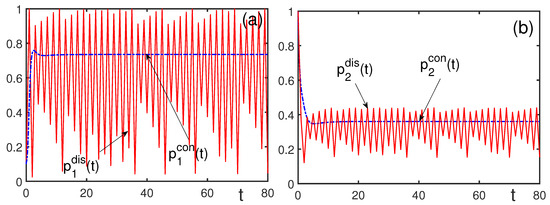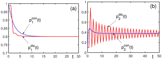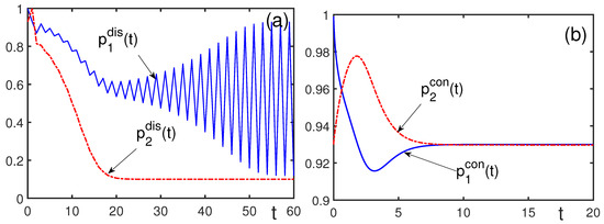 Solutions to discrete Equation (37) and to continuous Equation (43) for the initial conditions , , , and , in the absence of herding effect, when : (a) Discrete solution (solid line) and continuous solution (dashed-dotted line). Solutions and tend to the same fixed point ; (b) Discrete solution (solid line) and continuous solution (dashed-dotted line). Solution tends to the fixed point , whereas oscillates around with the constant amplitude. For the agents with long-term memory, both probabilities, discrete and continuous, tend to the same stable node, but for the agents with short-term memory, the fixed point for discrete probability is a stable limit cycle, while the continuous probability tends to a stable node.