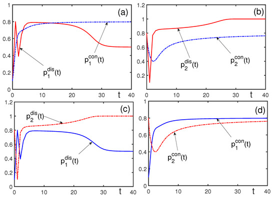 We have compared the solutions to discrete-time Equation (37) and continuous-time Equation (43), for the same sets of parameters and initial conditions. The society is composed of two groups, one whose members enjoy long-term memory and the other group, consists of members with short-term memory. Solutions for discrete equations are marked as and for continuous equations as . In all figures, time is dimensionless, being measured in units of . The results are discussed below.