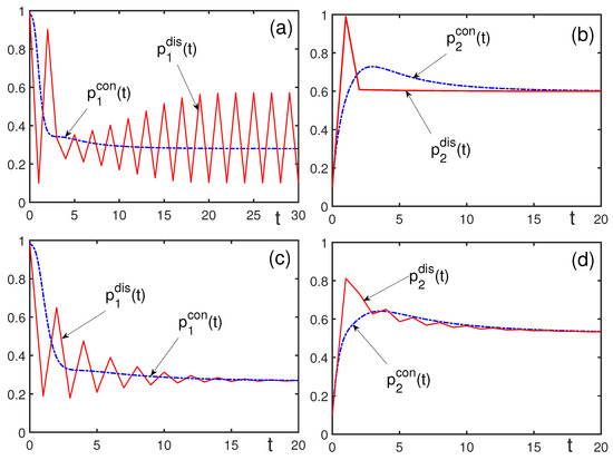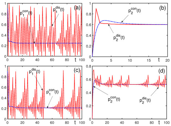 (a) Discrete solution (solid line) tends to the fixed point and continuous solution (dashed-dotted line) tends to the fixed point ; (b) Discrete solution (solid line) tends to , while continuous solution (dashed-dotted line) tends to ; (c) Solutions and ; (d) Solutions and . For , solutions and tend to the same fixed point , however solution tends to , whereas solution tends to . Discrete and continuous probabilities, though both being stable nodes, but tend to different fixed points.