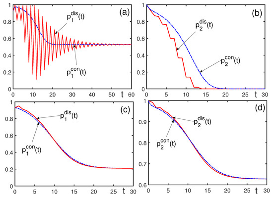 where is the limit of as time goes to infinity. However, strictly speaking, the discrete and continuous limits can be different, since the related expressions for the memory functions in the discrete and continuous cases are different. Also, the considered equations are not autonomous and contain time delay. In addition, even if the fixed points would be the same, the stability conditions of discrete, continuous, and delay equations, generally, are different [73,74,75]. Thus, numerical investigations are necessary.