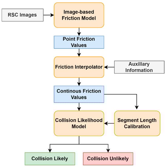 The proposed framework involves converting winter road surface condition (RSC) images into point friction values via an image-based friction model. Continuous friction values are then generated from these point measurements through an interpolator with the help of auxiliary information. Next, the continuous friction measurements are fed into a binary collision likelihood model developed through segment length calibration to output whether a collision is likely or unlikely. Figure 1 illustrates the proposed framework.