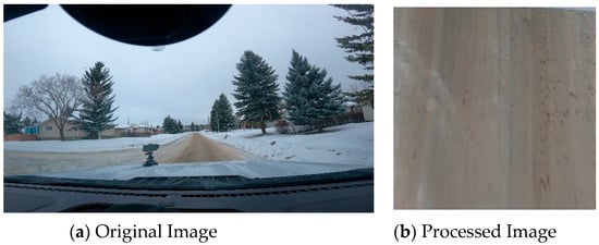 In total, 128 friction tests were performed over the course of four days (18, 19, and 25 January and 4 February 2022) alongside 10 h of dash camera road footage. An example of the road surface imagery recorded is shown in Figure 2a. Note that the actual input of the model is a cropped, transformed version of this image (shown in Figure 2b). This transformation converts the cropped image into a top-down view of the road surface.