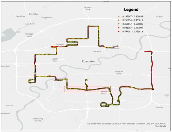 Generated continuous friction values and the selected section for interpolator evaluation (red box). The map shown is powered by ESRI. Sources: City of Edmonton, Esri Canada, Esri, HERE, Garmin, SafeGraph, Geotechnologies, Inc., METI/NASA, USGS, EPA, USDA, NRCan, Parks Canada [15].