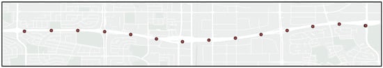 Within the friction dataset generated, the Whitemud Drive section was selected as the focus of this study due to the high friction variation present. After extracting data from this section, each friction measurement was averaged with neighboring values (50 m radius) to make the spatial patterns more distinct [17]. The generated friction values and the road section selected for this study are shown in Figure 3.