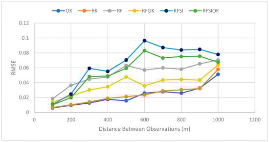 A total of six interpolators were examined: OK, RK, RF, RFSI, RFOK, and RFSIOK. In addition to the required positional data, elevation and slope information were included to assist in the interpolation task. Each interpolator was evaluated using the ten generated datasets with increasing separation distance. Their performances quantified by RMSE are depicted in Figure 6.