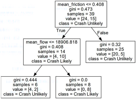 Overall, the optimal segment length was between 6.5 and 8.5 km because the friction values in this region were the least homogenized and had a balanced dataset. When we evaluated the internal logic of these models, we found that 7.0, 7.5, and 8.5 km produced highly complex models. Although they showed excellent performance, it was difficult to assess whether the generalizations made were reasonable. In contrast, the 6.5 km models were simple and intuitive (as shown in Figure 11) but had slightly lower accuracy of 76.9%. Ultimately, the choice of model depends on user preference, as there is a trade-off between model performance and intuitiveness. Herein, intuitiveness was prioritized.