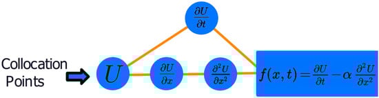 Collocation points in the experiments that follow are randomly generated values in the domains of their respective variables. These points can be selected using any sampling method such as Latin hypercube sampling (LHS) [18]. Collocation points feed into the automatic differentiation component of the PINN, as depicted in Figure 2, and the model parameters’ derivatives are taken with respect to x and t from the collocation points, following the formula in Equation (6). This process returns a value that is not equal to zero at first and the optimizer will simultaneously adjust the model parameters to reduce the overall loss. In doing so, both terms will tend toward zero, satisfying the initial and boundary conditions, and the general form of the PDE, yielding an approximation to a unique solution.