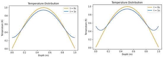 Temperature distributions of insulated boundary conditions (left) and convective boundary conditions (right) without source term.