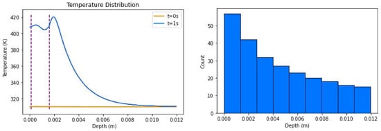 where denotes the material’s thermal diffusivity and U represents the solution. This version of the PDE includes a source term Q representing heat contributed by laser irradiation. Boundary conditions used for solving Equation (1) include insulated and convective boundary conditions. Solving this PDE will result in a function that gives the temperature at a time and depth of the material(s).