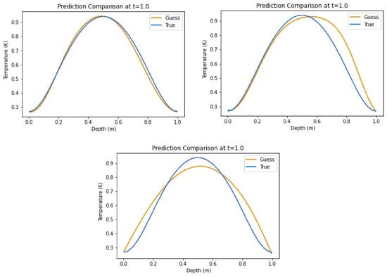 Representative non-source predictions for insulated boundary conditions using hybrid activation function combination (top left), all-Tanh activation function combination (top right), and all-ELU activation function combination (bottom).