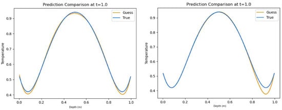 Convection boundary condition tests followed the same procedure as the insulated boundary conditions and the temperature distribution plot can also be found in Figure 4. The key difference is that the ambient temperature, set at 293.15 K, in the experiment had a measurable effect on the data generated. The energy flow across the system, from the ambient environment to the material, was captured in the boundary conditions and all other aspects of the experiment remained the same: random subset selection of boundary conditions, Latin hypercube sampling method for collocation points, and the , hyperparameter constants set to 21 and 1.