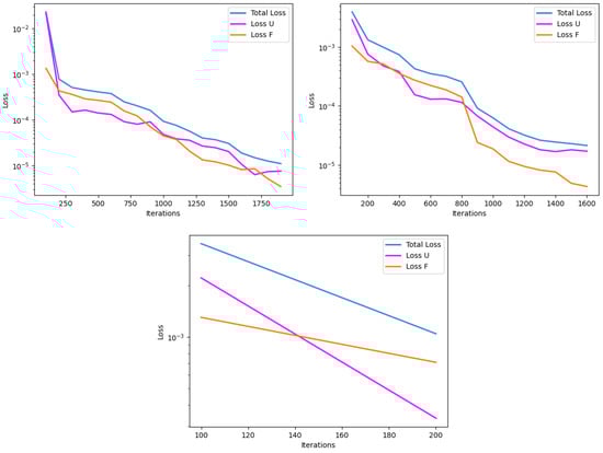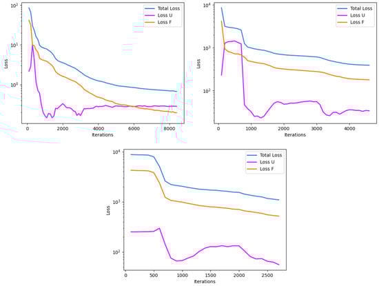 Representative depictions of the convergence plots for the with-source experiment, mapping iteration to loss reduction. U represents the initial and boundary condition term, and F represents the PDE residual term, in the loss function. The all-Tanh model (top left), hybrid model (top right), and all-ELU model (bottom) show their respective training behavior.
