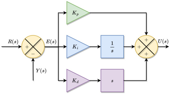 In the above equation, , , and are the proportional, integral, and derivative constants. The block diagram representation of the controller is shown in Figure 1. The figure and Equation (1) show that the PID controller combines the proportional, integral, and derivative control elements to provide a composite control signal that compromises error reduction, overshoot, and oscillation mitigation. The PID controller’s settings, such as the gains for each control term, can be tuned to obtain the desired performance for a particular system.