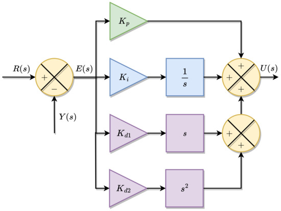 In the above equation, , , and are the proportional, integral, and derivative constants. is the constant for the extra derivative filter, which controls the smoothing of the derivative term over time. Figure 2, which shows the block diagram of the controller and Equation (5), the PIDD controller adds another derivative control element to the pre-existing PID control elements where all four constants can be tuned to achieve the desired performance characteristics.