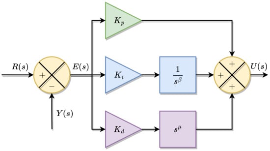 In the above equation, , , and are the proportional, integral, and derivative constants. The parameters and represent the degree of non-integer integration and differentiation used in the controller, respectively, where and [43]. Figure 3 shows the block diagram for the FOPID controller where all five parameters can be tuned. Notice that a regular PID controller is achieved by setting both and to be 1. By utilising non-integer values for the integral and derivative terms, the controller can simulate more complex and non-linear systems in control systems.