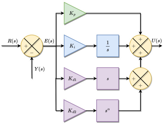 In the above equation, , , , and are the proportional, integral, and derivative constants. The order represents the non-integer differentiation parameter used in the controller. Figure 4 shows the block diagram of the proposed controller where the parameters can be tuned to control both linear and non-linear processes. A PID controller can be achieved when and PIDD controller can be achieved when , allowing the proposed controller to control linear order and non-linear processes.