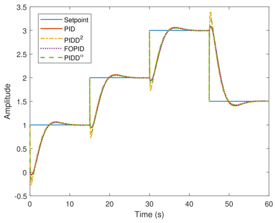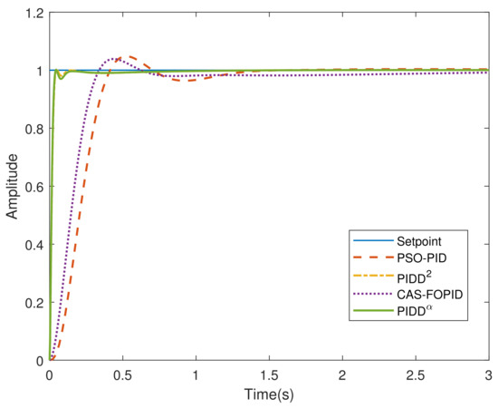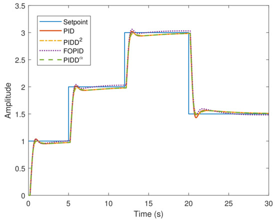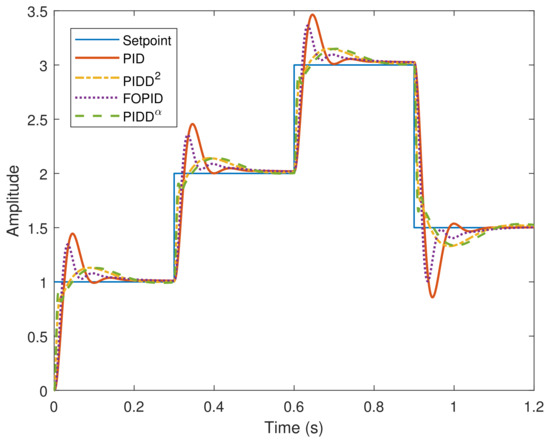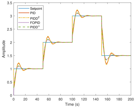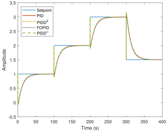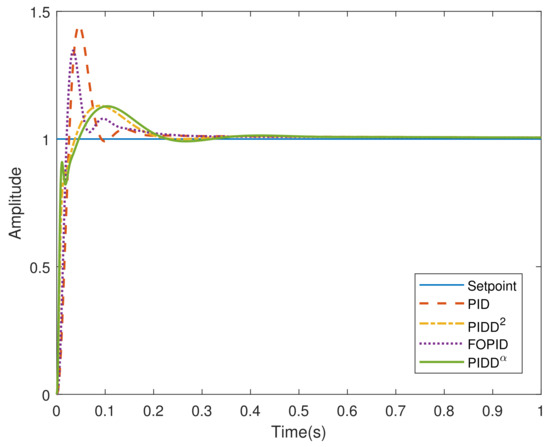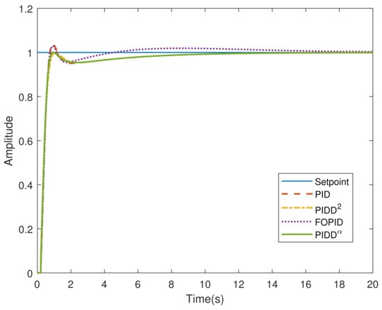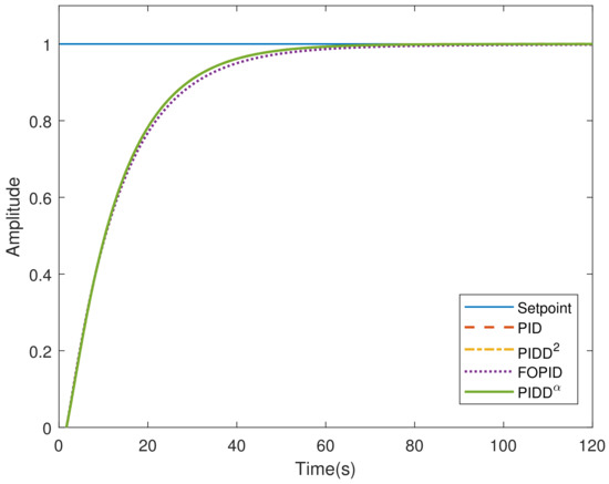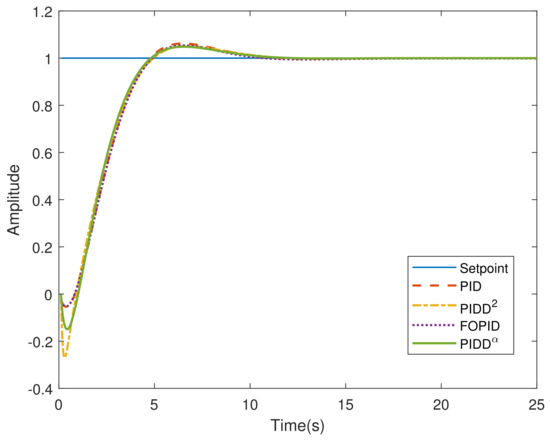 A generic mathematical equation representing a first-order equation is selected to simulate a PID, PIDD, FOPID, and PIDD controlling a plant in a simulation. An RC low-pass filter circuit is an example of a real-life first-order system. To obtain the closed-loop transfer function of the entire system, Equation (10) is used with substituted with Equations (1), (5), (8) and (9), and . The controller gains, fractional parameters, and transient response characteristics used are shown in Table 2 and Figure 6, Figure 7 and Figure 8.