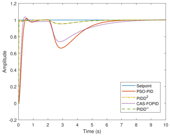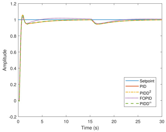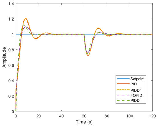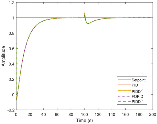 Figure 7 shows that each controller structure can manage the output to reach each set-point change. In terms of overall performance, the proposed PIDD controller outperforms its competitors. For disturbance rejection, a disturbance magnitude of −0.2 is introduced to the controller structure at the 60 s to replicate external disturbances that can take place in a real-world plant environment. Figure 8 illustrates that each controller structure can reject the disturbance by managing the output to reach the set-point following the step response. Overall, the proposed PIDD controller achieves the best overall performance compared to its competitors.