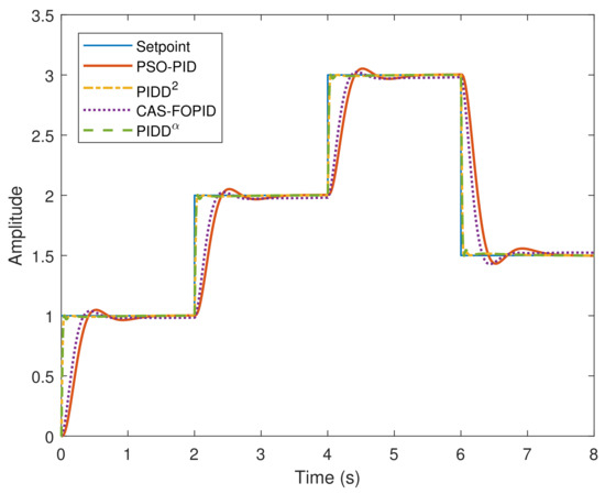 The initial set-point is designated 1 when the time is 0 to monitor set-point tracking performance. After that, at 50 s, 100 s, and 150 s, the set-point changes to 2, 3, and 1.5, respectively. These changes cover both positive and negative changes in the controller. The set-point changes at intervals of 50 s to ensure that the step responses can reach their respective steady-state values, as specified in Table 2.