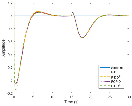 Here, each controller structure can control the output for achieving each set-point change following the step response. The proposed PIDD controller outperforms its competitors, delivering the best overall performance. Further, to simulate plant behaviour where external disturbances occur, a disturbance magnitude of −0.2 is introduced to the controller structure at 15 s for disturbance rejection. Figure 11 demonstrates that each controller structure can reject the disturbance by controlling the output to attain the set-point following the step response. The proposed PIDD controller stands out from its competitors, delivering the best overall performance.