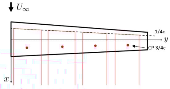 The solution of potential flow could be solved using analytical methods, but obtaining the mentioned solutions is only possible in very specific and limited cases. If appropriate simplifications are made on geometric surfaces (curvature, thickness, etc.), it allows linearizing the problem and applying numerical techniques. There are different software that have been developed in the past years for different applications and that solve the aerodynamic problem using the Navier–Stokes equations for potential flow equations [4,5]. To simulate using the method of small perturbations on a three-dimensional wing, it could be achieved using distributions of singularities (elementary solutions); a horseshoe vortex distribution forms the basis of the VLM method. This way, problems can be solved on three-dimensional lifting surfaces with dihedral, sweep, and even sideslip. This is a generalized solution of Prandtl’s lifting-line theory.