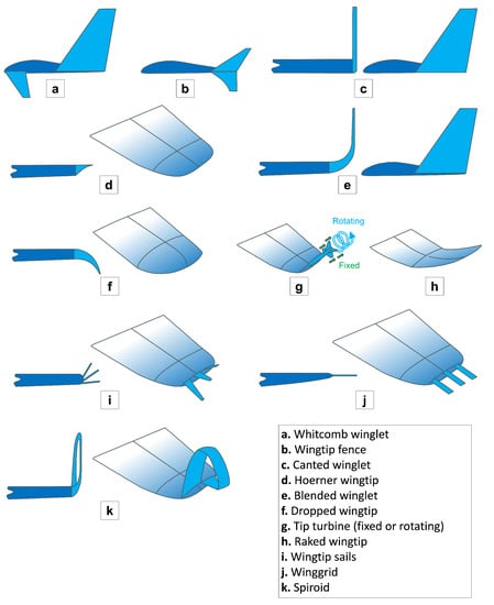 The wings to be studied in this article are those that introduce wingtip devices. Winglets are becoming increasingly important elements in aircraft design, as operating costs and environmental concerns are on the rise. Therefore, from an aerodynamic point of view, wingtip devices are able to reduce induced drag [13] and increase aerodynamic efficiency. Figure 2 presents different configurations that have been used or are in development.