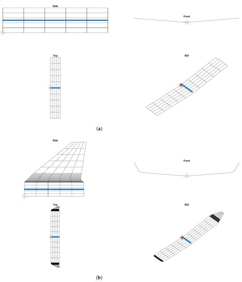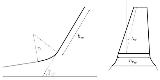 The dihedral () and the sweep () in the point c/4 have the same calculation by changing the parameter. The winglet dihedral () is known. The total dihedral of the joint (), the dihedral increase () and the dihedral in each component () are calculated with Equations (5)–(7), respectively.