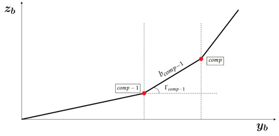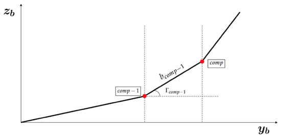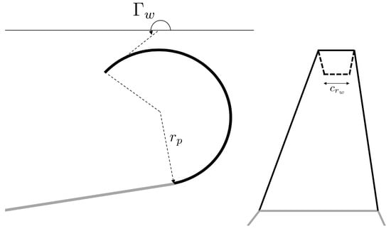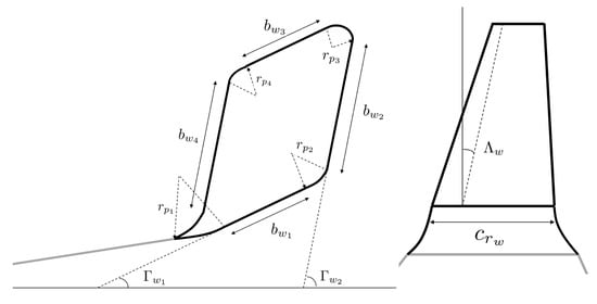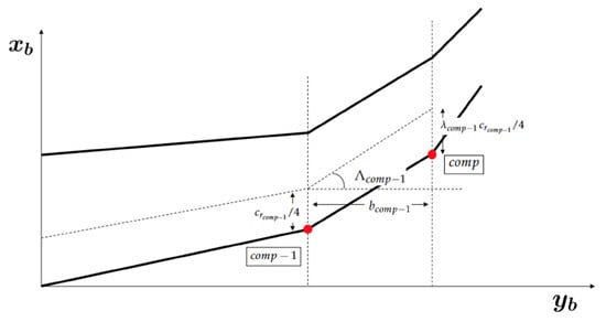 The new setting that has to be made with the winglets is to define the start of the next component. Using Figure 7 and Figure 8, the component , , and coordinates can be calculated with Equations (9)–(11).