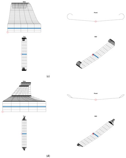 In Figure 13, the different 3D views of the complete wing are presented. In this view, the components, wing and winglets are observed. Figure 13b–d are the configurations with winglets, so when the curve part starts, the components of the joints between the wing and winglet can be seen. It can be noticed that for the open spiroid, the components are distributed in a more progressive way since the turn is smoother. The blended and the closed spiroid winglets have closer joints when the winglet starts since the turn is more aggressive.