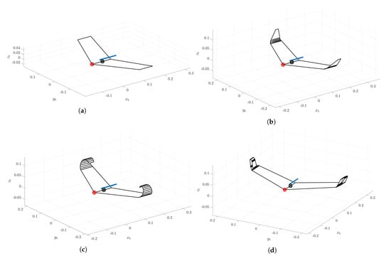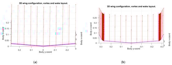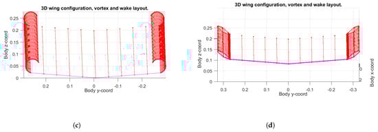 Finally, TORNADO has also the option to represent an estimation of the vortex and the wake structure. Those results are collected in Figure 14, and they depend on the number of panels that are used for dividing the wing structure. The red lines show the structure that the wake will follow. The concentration of these red lines at the ends means the concentration of the vortex in those areas. A first early conclusion can be observed in Figure 14c,d; they both can change the vortex size, helping in reducing the induced drag.
