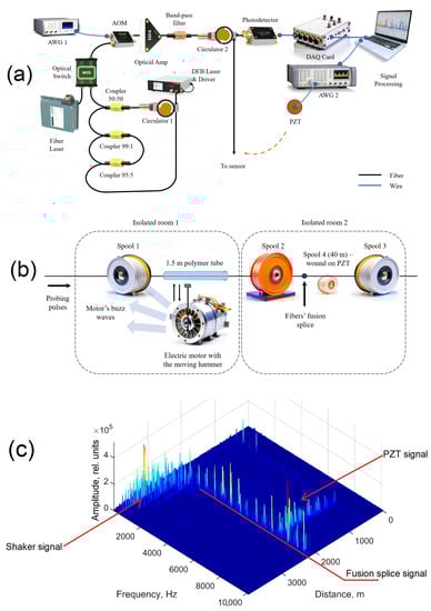 DAS traces were recorded using a commercial laser with a wavelength of 1552.5 nm and a homemade radiation source based on a telecom laser with a wavelength of 1548.5 nm. The experimental setup previously used in [33] is shown in Figure 1a.