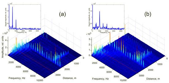 Distributed fiber optic sensors are one of the most dynamically developing scientific and technical areas today [1,2,3,4]. Practice shows that they can be used to obtain information regarding the distribution of factors of almost any origin affecting the optical sensor. Distributed fiber optic sensors capable of recording events at a high frequency are of particular interest. As the frequencies detected by the instruments of this type in most cases turn out to be acoustic, such distributed sensors have also become known as acoustic (Distributed Acoustic Sensors—DAS) [5,6,7,8,9,10,11,12]. Since they make it possible to register the optical fiber longitudinal deformation changes at each point with frequencies from units of hertz to tens of kilohertz, it is not surprising that their use was not limited to the quite obvious functions of protection of perimeters, pipelines, and critical infrastructure facilities, but began to develop towards metrology and flaw detection. Such problems quite often require one to search for individual acoustic frequencies inherent in certain events or defects. For instance, in [13], the acoustic signal of a sensor cable laid along the railway track and perceiving the vibrations of passing trains was studied. In [14,15], the problem of fluid flow monitoring was considered. In [16], an attempt was made to solve the problem of the pipeline state monitoring and protection using DAS. In all cases, a useful signal consists of one or more individual peaks in the acoustic spectrum. Each of them must be identified by frequency and spatial coordinate. Together with other reflectometric methods that study slowly changing physical quantities in new materials and structures [17,18,19,20], distributed acoustic sensors for flaw detection problems form a complete understanding of the object’s behavior in a wide range of external conditions [21,22]. Thus, in [21], distributed acoustic monitoring was used to study the operating regimes of a gas turbine. The nature of useful data and noise visually largely coincides with the images obtained in [13,14]. The authors of [22] used DAS to study the spectral composition of self-oscillations of aircraft structures. Similar problems frequently arise in various fields of science and technology and are often solved by acoustic emission sensors [23,24,25]. However, this type of sensor has its own limitations. One of them is the inability to monitor the entire object, since in most of their technical implementations, these sensors are pointwise. As stated in [26], the detection of small details and flaws can be quite easily carried out with pointwise sensors, whereas it is not suitable for studying the whole mechanism assembled from such elements. Tested objects constructed from individual simple elements have a much higher probability of failure than these individual elements. To study such breakdowns, pointwise sensors are not applicable. Thus, some of distributed sensors were purpose-built to study the acoustic emissions of whole machines and assemblies [26,27,28]. Since the characteristic frequencies of acoustic emissions are much higher than those used by typical DAS, it was necessary to extend the frequency response of optoelectronic systems. Various effective approaches have been used for this: studied area frequency domain transition (since a continuous signal is used, the time between the pulses no longer limits the upper acoustic frequency) [29]; the use of fiber Bragg gratings (each grating in the fiber can be interrogated as a separate sensor) [30,31]; the use of pulses with different laser frequencies (allows one not to wait for the previous pulse comeback to send a new one—the maximum recording frequency of 80 kHz was reached for a fiber length of 5 km) [32].