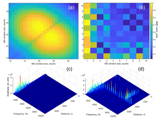SNR dependence on the MA and MD window size for 500 Hz (a) and 8000 Hz (b) events; the commercial laser obtained DAS data, processed using MA-MD technique with MA and MD window sizes (c) 19 and 24 counts, respectively; (d) 7 and 1 counts, respectively.