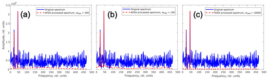 Original and AFDA-processed spectra at different = 0.5; (a) = 500; (b) = 100 counts. (c) Original and FDDA-processed spectrum at = 10,000 counts.