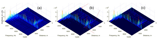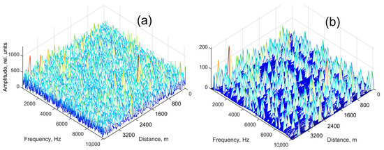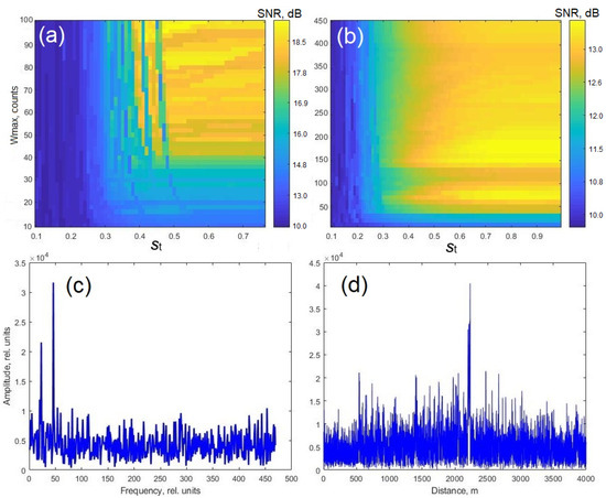 The optimal value of for the cross section 6c (Figure 6c) was 98 counts, and was 0.51. For cross section 6d (Figure 6d), these values were 180 counts and 0.85, respectively. The obtained results allowed us to draw conclusions not only regarding the existence similarity of optimal values for similar ratios of amplitudes and the local signal bandwidth in the spatial or frequency domain, but also regarding the validity of the previous assumptions. Thus, the useful signal bandwidth in the frequency domain was about 100 rel. units, and in the spatial, about 200. The calculated optimal values turned out to be approximately equal. Therefore, when processing the 2D data (acoustic spectrum distribution over space, Figure 2, for instance) with AFDA, firstly, all of the frequency-domain cross sections were processed with = 100 rel. units, and the spatial ones with = 200 rel. units. It also has been noticed that it is this sequence that results in a slightly better SNR than the opposite.