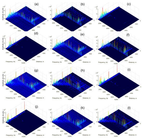 Data (a–f) obtained using the commercial laser (CL); (g–l) obtained using the homemade laser—HL; (a,g) without filtering; (b,h) filtered with AFDA; (c,e,i,k) filtered with MA-MD; (d,f,j,l) filtered with MA-MD and AFDA. (c,d,i,j) MA-MD was adjusted to a 500 Hz frequency band; (e,f,k,l) MA-MD was adjusted to an 8 kHz frequency band.