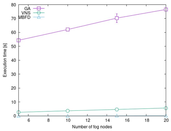 In Figure 2, we present a comparison of the heuristics’ execution time as a function of the number of fog nodes. Here, it is worth recalling that in order to keep the load even, we increase the number of service chains to be allocated along with the number of fog nodes.