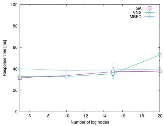 Throughout our experiments, we evaluated the time required by each algorithm to solve the problem, with the MBFD heuristic being the fastest by at least one order of magnitude compared to VNS and GA being the slowest at one order of magnitude slower than VNS. The fast execution of MBFD results in lower quality results, with an average response time that can be nearly 30% higher compared to the best solution found. As the problem size grows, the GA and VNS heuristics tend to have worse performance, with VNS providing the worst quality solutions for large problems (+40% response time). It can be observed that as the the average load on the infrastructure grows, the MBFD heuristic outperforms the other approaches thanks to its focus on load balancing. This effect is additionally observed when short chains of microservices can lead to significant load unbalancing.