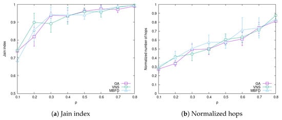The MBFD algorithm provides remarkably good performance in high load conditions. The reasons behind this behavior can be explained from the graphs in Figure 5. In particular, in Figure 5a it can be observed that the Jain index is generally good for every value of . For MBFD this is natural, as the algorithm is explicitly designed to guarantee good load balancing, ensuring good performance even if the algorithm does not explicitly the global response time take into account. At the same time, in Figure 5b the number of hops increases for every algorithm as the load grows. This occurs because it becomes more and more difficult to place the microservices close one to the other as the risk of incurring overload increases.
